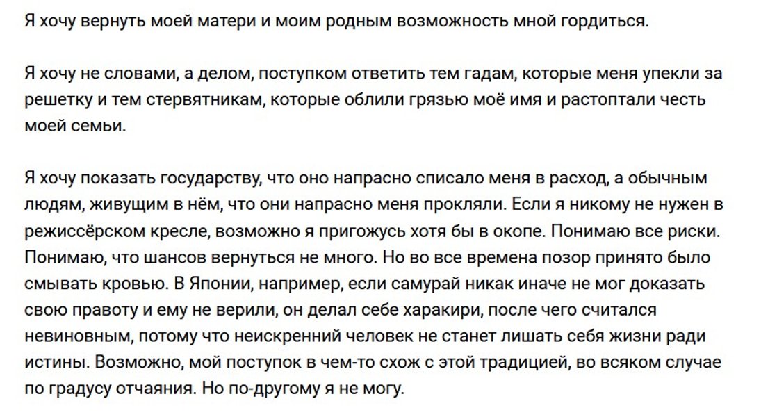 Сообщение с заявлением о заключении контракта с Минобороны РФ режиссер написал 5 ноября. Тогда же отметил, что через неделю надеется оказаться на передовой. Уже 10 ноября — сообщение в военной форме и заявление, что с понедельника, то есть с 13 ноября, он идет в бой.