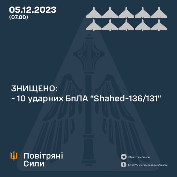 Важно"Всего зафиксировано 17 ударных БпЛА типа "Шахед" и шесть зенитных управляемых ракет ЗРК С-300. В результате боевой работы уничтожено 10 ударных БпЛА в разных регионах Украины. К отражению воздушного нападения противника привлечены истребительная авиация, зенитные ракетные подразделения и мобильные огневые группы Воздушных сил и Сил обороны Украины", — сообщили в Воздушных силах.