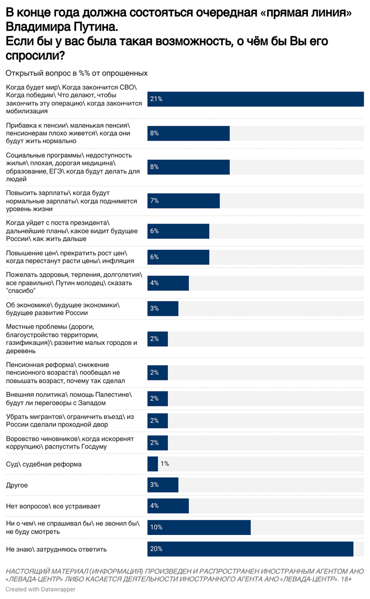 В преддверии "прямой линии" с президентом России Владимиром Путиным, запланированной на 14 декабря, больше всего россияне хотели бы спросить его о том, когда закончится война в Украине. Об этом свидетельствуют данные опроса "Левада-центра".