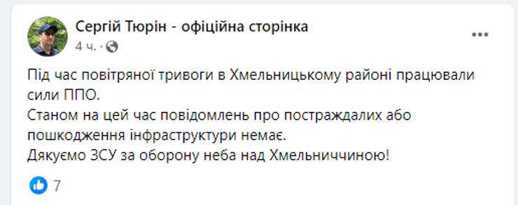 "По состоянию на это время сообщений о пострадавших или повреждения инфраструктуры нет. Спасибо ВСУ за оборону неба над Хмельницкой областью!" — уточнил Тюрин.