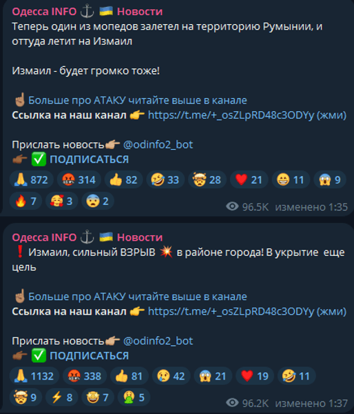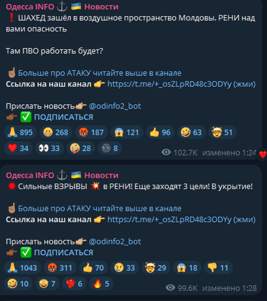 Паблики утверждают, что во время атаки на Одесскую область российские ударные БПЛА зашли на территорию Молдовы и Румынии. Впрочем, официальных сообщений на этот счет пока нет.