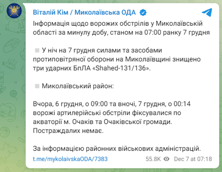 Как рассказал руководитель Николаевской ОВА Виталий Ким, в области уничтожены три ударных БПЛА Shahed.