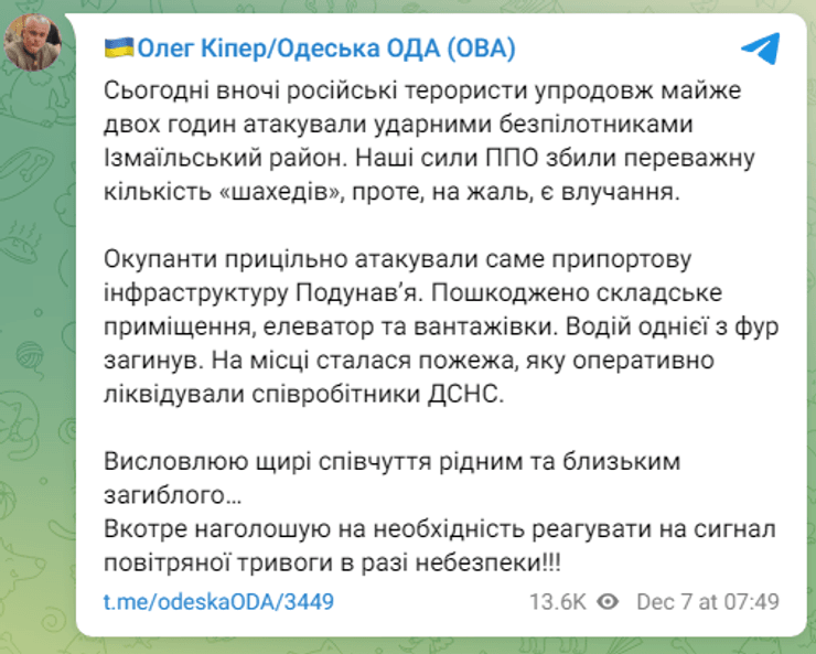 Как сообщил глава Одесской областной военной администрации Олег Кипер, в регионе беспилотники атаковали припортовую инфраструктуру в Измаильском районе. Повреждены складское помещение, элеватор и грузовики. Водитель одной из фур погиб.