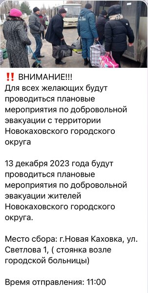 В заметке уточняют, что эвакуация проводится в связи с тем, что населенные пункты Новокаховского городского округа "находятся в 15-километровой зоне левого берега Днепра на линии боевого соприкосновения", для тех, "кто желает добровольно выехать на безопасную территорию и не имеет возможности сделать это самостоятельно".