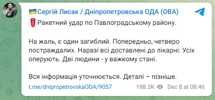 В 8:46 глава Днепропетровской ОВА Сергей Лысак сообщил, что в ходе обстрела Павлоградского района погиб один человек, еще четверо получили ранения различной степени тяжести.