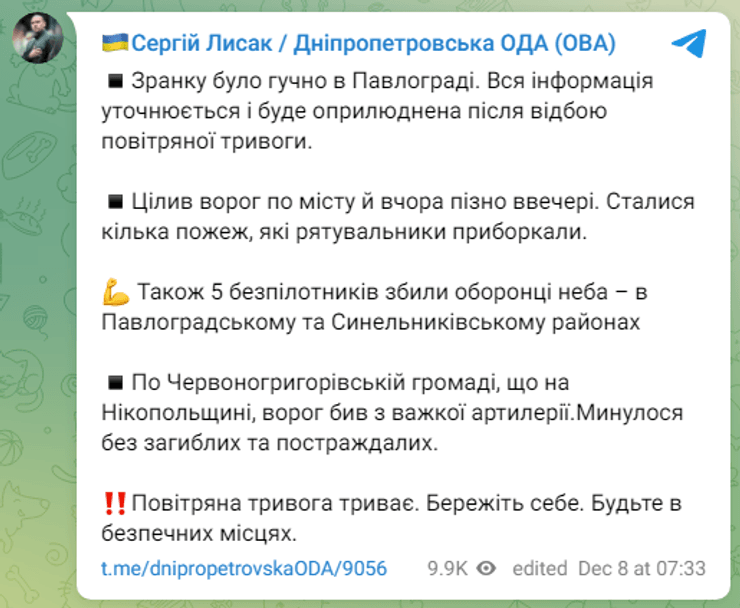 "Утром было шумно в Павлограде. Вся информация уточняется и будет обнародована после отбоя воздушной тревоги", — сообщил руководитель ОВА.