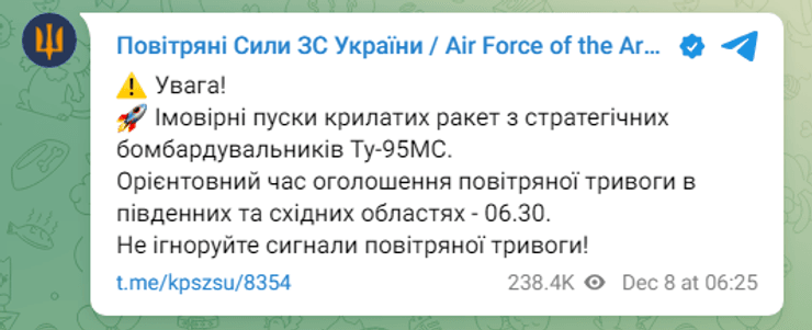 "Внимание! Вероятные пуски крылатых ракет из стратегических бомбардировщиков Ту-95МС. Ориентировочное время объявления воздушной тревоги в южных и восточных областях — 06.30. Не игнорируйте сигналы воздушной тревоги!" — сообщили в Воздушных силах.