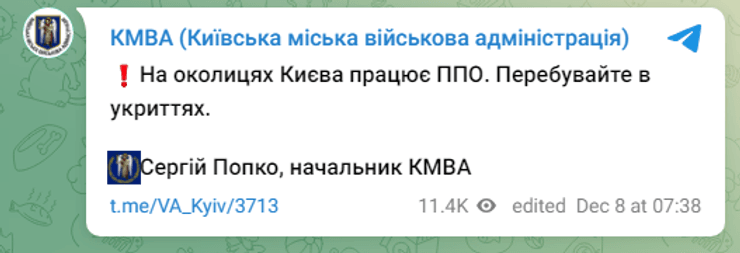 "Воздушная тревога в столице продолжалась почти 2 часа. Но ни одна вражеская цель не достигла города. Силами и средствами ПВО все ракеты, которые летели в направлении Киева, были уничтожены еще на подлете к столице. Информация о жертвах и разрушениях отсутствует! Как вы видите, враг дождался своего часа и начал снова применять стратегическую авиацию для атак на мирные города. Поэтому берегите себя и родных, не пренебрегайте сигналами воздушной тревоги", — заявил Попко.