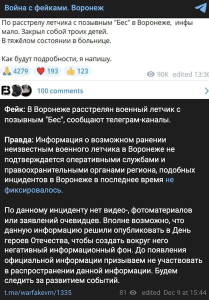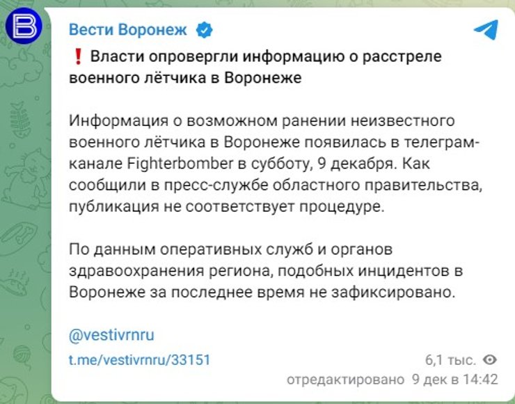 "Информация о возможном ранении неизвестным военного летчика в Воронеже появилась в telegram-канале Fighterbomber в субботу, 9 декабря. Как сообщили в пресс-службе областного правительства, публикация не соответствуют действительности", — говорится в сообщении.