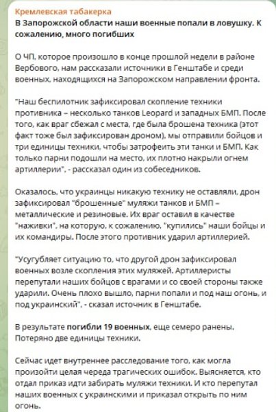 Отмечается, что ЧП произошло на прошлой неделе в районе Вербового на Мелитопольском направлении. Беспилотник оккупантов якобы зафиксировал несколько танков Leopard и западных БМП. Россияне решили "затрофеить" оставленную западную технику.