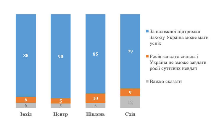 По регионам Украины распределение результатов свидетельствует, что этот от места проживания результат лишь незначительно зависит. В восточных регионах доля тех, кто уверен в успехе Украины, составляет 79% против 9%, в южных — 85% против 10%.