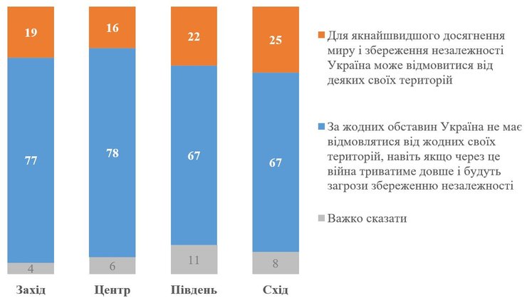 Несмотря на рост готовности к уступкам, во всех регионах значительное большинство респондентов (от 68% до 79%) остается против территориальных уступок России.
