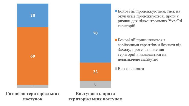 По данным Киевского международного института социологии, большинство граждан, которые высказались за территориальные уступки, все же верят в победу Украины при должной поддержке Запада.
