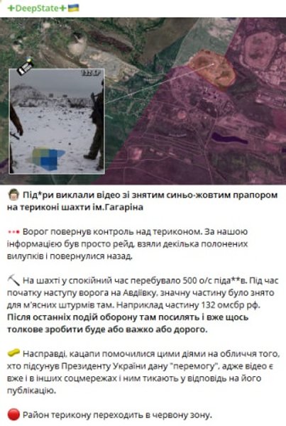 "Враг вернул контроль над терриконом. По нашей информации был просто рейд, взяли несколько пленных россиян и вернулись обратно. На шахте в спокойное время находилось 500 личного состава ВС РФ. Во время начала наступления врага на Авдеевку, значительная часть была снята для мясных штурмов там. Например, часть 132 ОМСБр РФ. После последних событий оборону там усилят, и уже что-то толковое сделать будет или трудно, или дорого", — говорится в публикации.