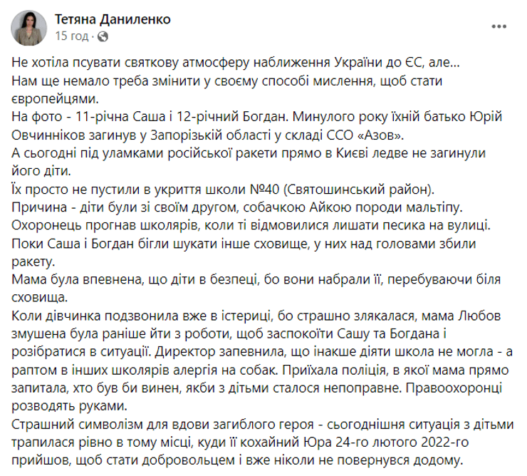 Также журналистка отметила символизм этого инцидента, ведь этот случай произошел в школе, куда в первый день полномасштабного вторжения России обратился отец детей, чтобы стать добровольцем. Впрочем он погиб, защищая Украину.
