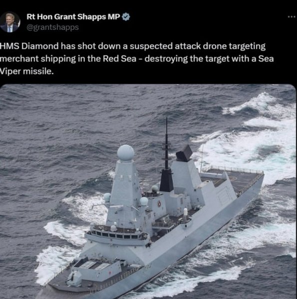 "Ночью HMS Diamond сбил предполагаемый ударный беспилотник, который целился в торговое судно в Красном море. Одна ракета Sea Viper была выпущена и успешно уничтожила цель", — проинформировал он.