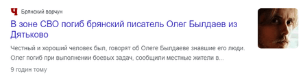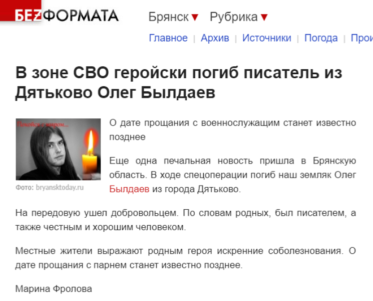 "Вчера утром мы узнали трагичную новость, что на передовой погиб доброволец СВО и дятьковский писатель Олег Былдаев, а также честный и хороший человек", — писали брянские сайты, пообещав назвать "дату прощания с военнослужащим".