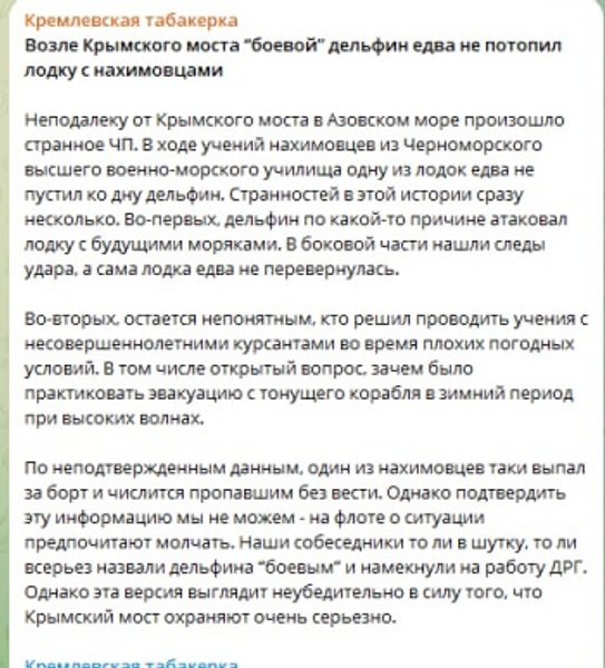 Собеседники "Табакерки" назвали дельфина "боевым" и намекнули, что это также могла быть диверсия.