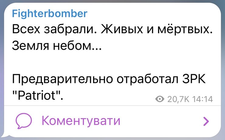 Впоследствии бывший военный летчик РФ распространил сообщение, где сообщил, что всех членов экипажа "живых и мертвых" забрали. По его предварительной информации, отработал ЗРК Patriot.