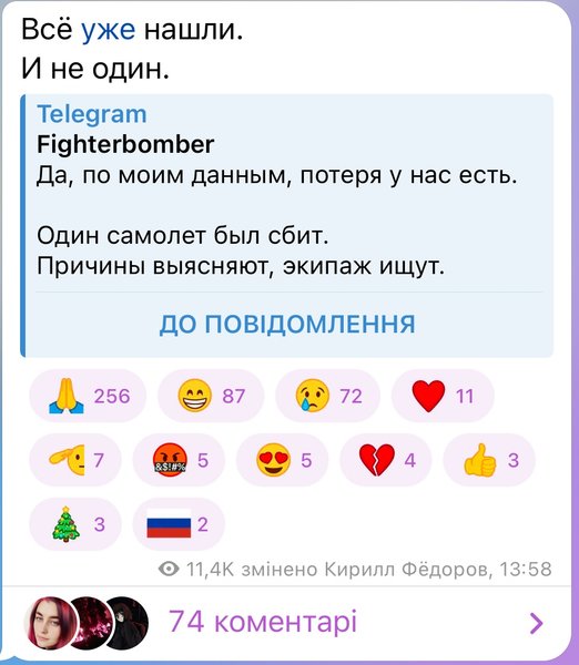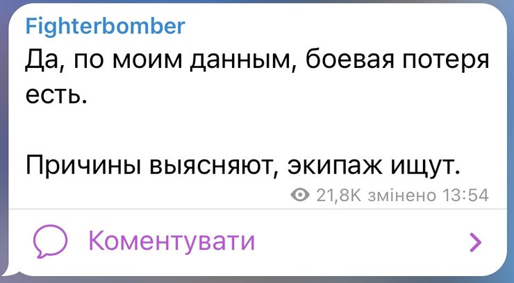 В Telegram-канале Fighterbomber, который ведет бывший военный летчик РФ, а ныне пропагандистский блогер Илья Туманов, подтвердили потери ВС РФ, однако, рассказали о якобы одном сбитом самолете.