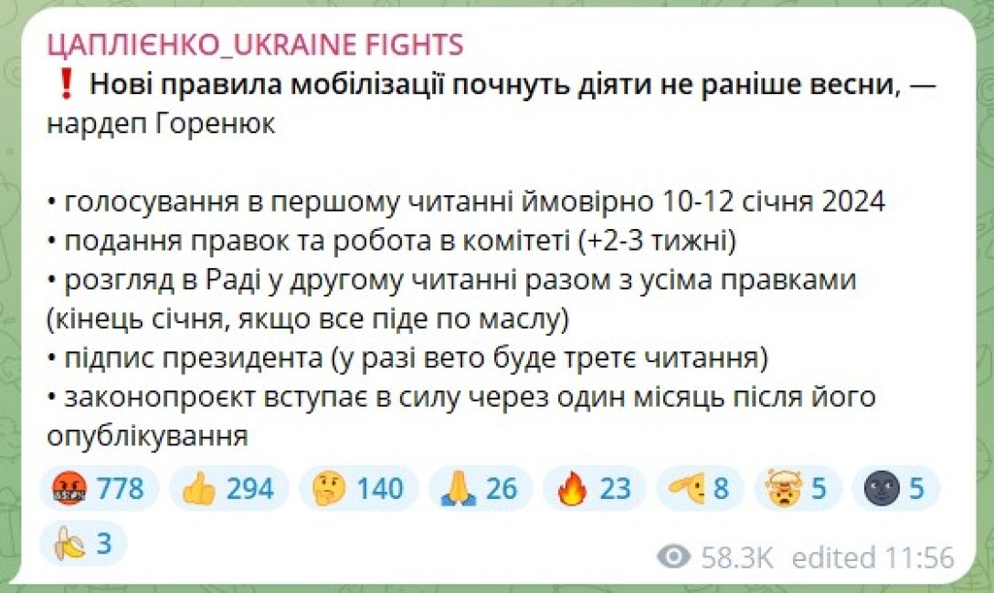 Народный депутат от "Слуги народа" Александр Горенюк заявил, что новые правила мобилизации в Украине начнут действовать не раньше весны. Об этом сообщил журналист Андрей Цаплиенко в Telegram.