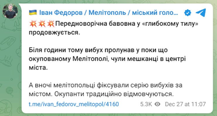 Около 10 часов утра 27 декабря в оккупированном Мелитополе прозвучали взрывы. Как сообщил мэр города Иван Федоров, громко было в центральной части Мелитополя. Кроме того, в ночь на 27 декабря жители слышали взрывы за чертой города.
