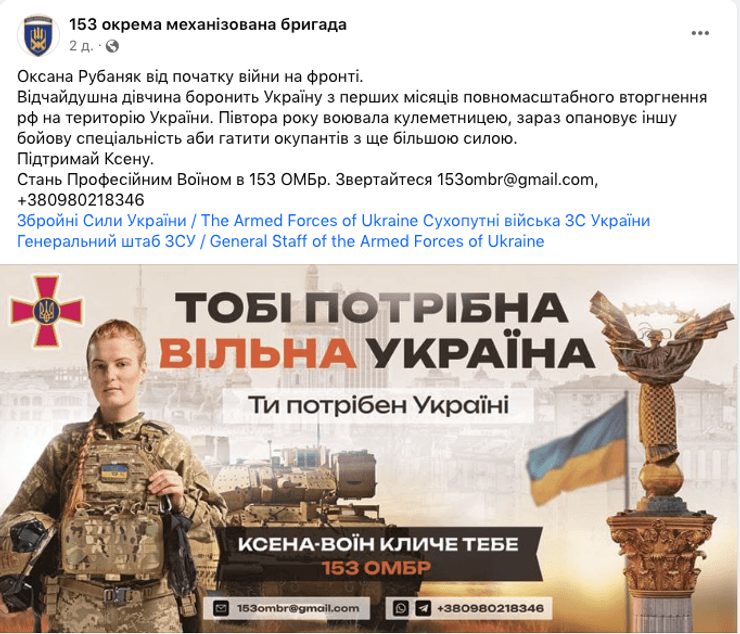 Ядро новосформированной 153-й механизированной бригады составили пулеметчики 72-й ОМБр им. Черных Запорожцев. Среди бойцов нового образования — Оксана Рубаняк, известная 20-летняя блогерша.
