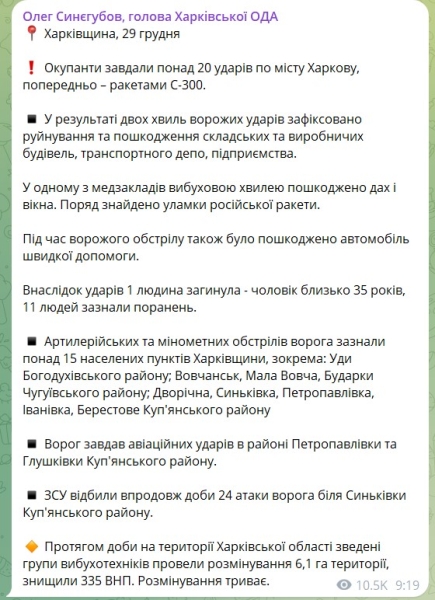 Председатель Харьковской ОГА Олег Синегубов сообщил, что российские военные нанесли более 20 ударов по Харькову, предварительно ракетами С-300.