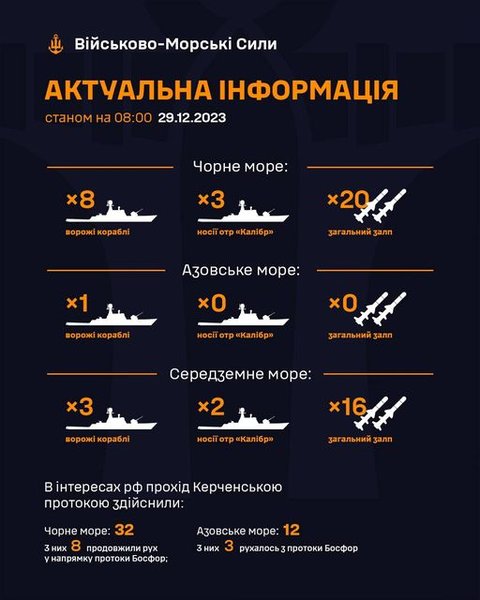 Утром 29 декабря российские оккупанты вывели на боевое дежурство в Черное море 8 кораблей, из которых три ракетоносителя. Об этом сообщает командование Военно-Морских сил Украины.