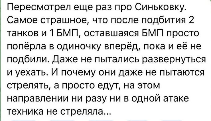 "Пересмотрел еще раз про Синьковку. Самое страшное, что после подбития танков и БМП, уцелевшая БМП просто поперла в одиночестве вперед, пока ее не подбили. Она даже не пыталась развернуться и уехать. И почему они даже не пытаются стрелять, а просто едут. На том направлении ни во время одной атаки техника не стреляла", — смущается Радов.