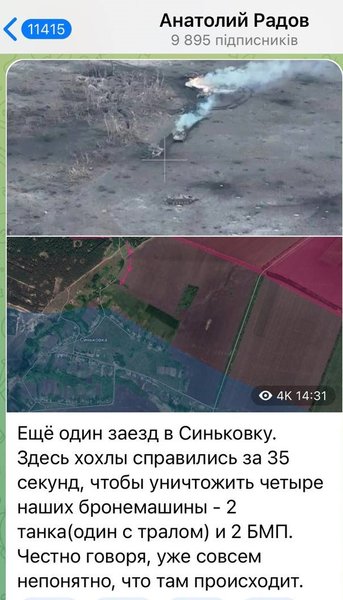 "Еще один заезд в Синьковку. Х*хлы справились за 35 секунд, чтобы уничтожить 4 наших бронемашины — 2 танки (один с тралом) и 2 БМП. Честно говоря, уже непонятно, что там происходит", — написал он.