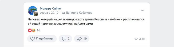 Так в Беларуси в мозырской группе объявлений о потере вещей 27 декабря появилось сообщение о потере военной карты армии РФ. Объявление опубликовал военнослужащий РФ — 19-летний Даниил Кабаков. Он проинформировал, что карта была утеряна в ночном клубе в центре Мозыря "Намбик". После потери карты с нее начали списываться средства. В объявлении Кабаков пригрозил нашедшему: "...отдай карту по-хорошему, или найдем сами".