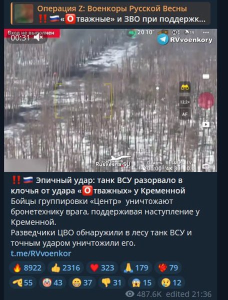 Также Combat footage UA в противовес посту пропагандистов добавляет видео работы аэроразведчиков 1-й бригады оперативного назначения бригады "Буревій" НГУ, где видно, как этот самый "уничтоженный украинский танк" едет по лесу, и как они впоследствии попадают по нему дроном.