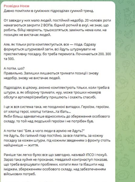 "Давно заметили в смежных подразделениях печальный тренд. Всегда у них мало людей, постоянный недобор. 20 человек роты пытаются закрыть 2 ВОПа, бедный ротный в аху*, не знает, что делать, бойцы болеют, "трехсотятся", заменить некем, на позициях не хватает людей. Но, как только рота комплектуется, все — п**да. Сразу формируется штурмовой отряд, все идут штурмовать не перспективную посадку, потому что надо победа. Начинается 200, 300 и 500", — пишет он.