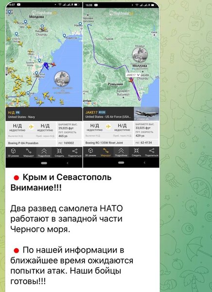 "Два разведсамолета НАТО работают в западной части Черного моря. По нашей информации в ближайшее время ожидаются попытки атак. Наши бойцы готовы", — говорится в сообщении.