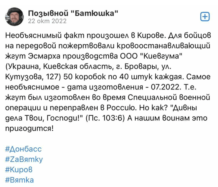 Как отметил источник, отдельным свидетельством в этом деле являются посты в запрещенной в Украине соцсети "ВКонтакте", где оккупанты радуются, что на передовую завезли жгуты украинского производства.