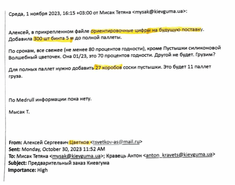 "Хотя в компании и заявляют, что поставляли товары тактической медицины исключительно в Эстонию, на самом деле прибалтийская фирма была лишь прокладкой. Например, директор отдела логистики "Киевгумы" Татьяна Мысак напрямую общалась с представителем российского ООО "МКТ". Так же она пишет и эстонским менеджерам — мол, товар пойдет в Кронштадт, Санкт-Петербург и Москву. Все письма — с копией на основателя украинской компании Антона Кравца", — рассказал источник.