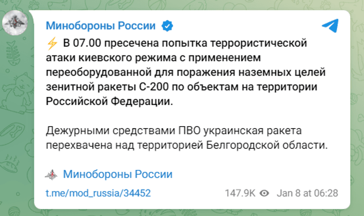 Отметим, что утром 8 января в Минобороны РФ заявили, что над Белгородской областью якобы сбили украинскую ракету С-200. Они назвали это "террористической атакой".
