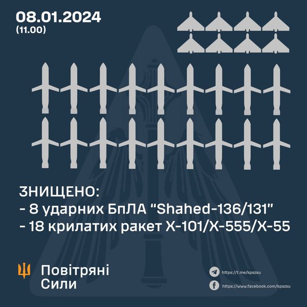 "Защитники неба уничтожили: 8 ударных БпЛА Shahed-136/131 и 18 крылатых ракет Х-101/Х-555/Х-55. Стоит добавить, что не все вражеские ракеты, которые не удалось сбить, достигли своих целей", — сообщили в Воздушных силах Украины.