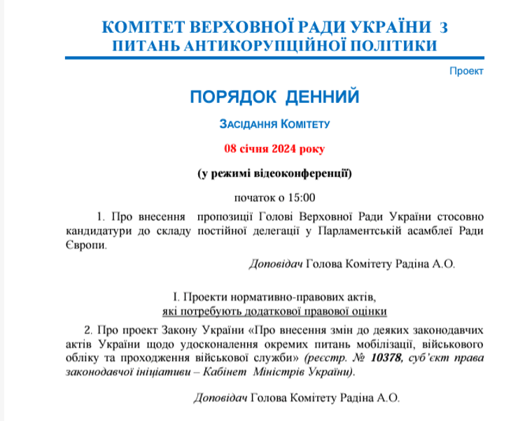 Отметим, заседание профильного комитета было запланировано на 15 часов 8 декабря. Вторым вопросом в повестке дня указано рассмотрение проекта закона № 10378, внесенного Кабмином, "О внесении изменений в некоторые законодательные акты Украины относительно усовершенствования отдельных вопросов мобилизации, воинского учета и прохождения военной службы".