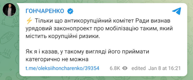 "Только что антикоррупционный комитет Рады признал правительственный законопроект о мобилизации таким, который содержит коррупционные риски. Как я и говорил, в таком виде его принимать категорически нельзя", — сообщил Гончаренко.