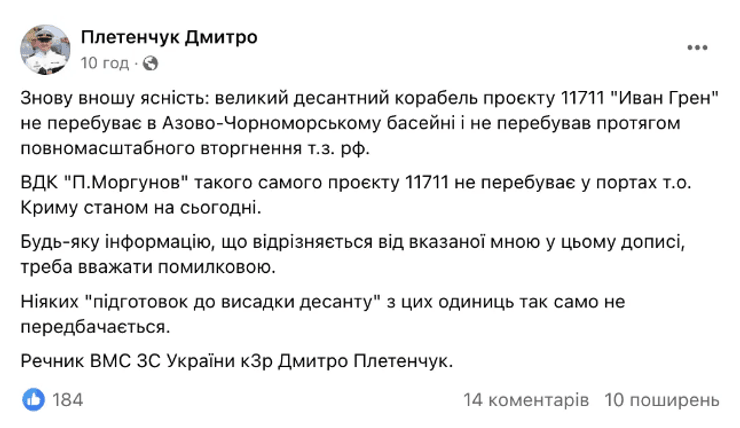 Представитель ВМС Украины Дмитрий Плетенчук отметил, что любую информацию, отличающуюся от той, которой он поделился в Facebook, следует считать ложной.