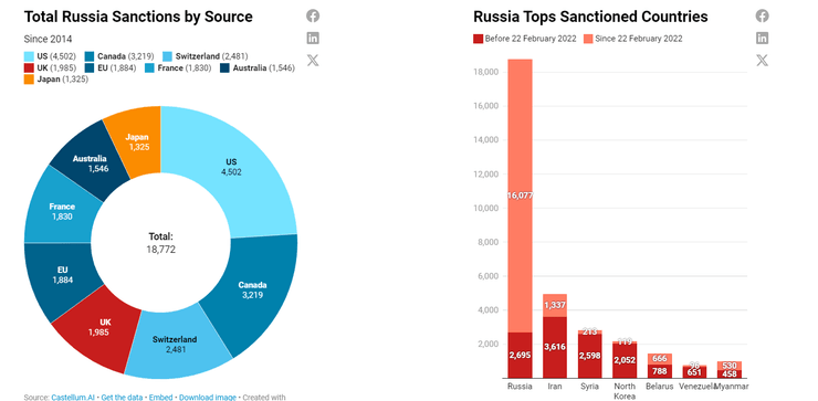 График показывает, что вторжение РФ в Украину 24 февраля 2022 года сделало Россию крупнейшим врагом Соединенных Штатов в Западной Азии. Лидерами нынешнего раунда санкций против России являются США, Канада, Швейцария и Великобритания с 3551, 2765, 2225 и 1749 ограничениями соответственно. Большинство из этих санкций нацелены на физических лиц (11 462), в то время как против юридических лиц действуют 4344 санкции, против судов — 169 и самолетов — 102.