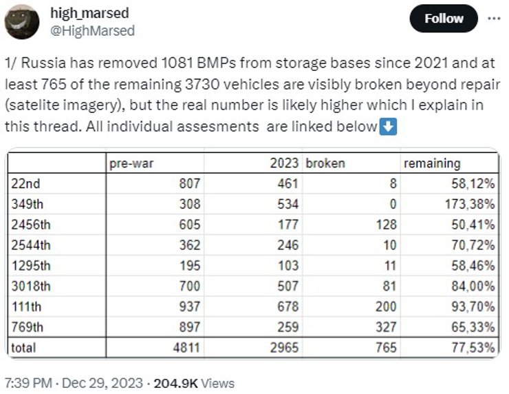 Неприглядная ситуация сложилась и с техникой, которая была произведена еще в советские времена и находится на хранении. Согласно подсчетам, основанном на спутниковых снимках, у РФ на хранении осталось около 3000 единиц старых БМП, 700 из которых полностью сломаны и не подлежат восстановлению.