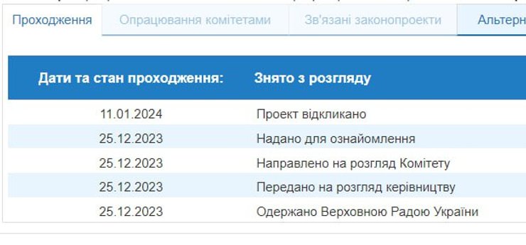 Речь идет о законопроекте №10378. В статусе документа сказано, что 11 января "проект отозван и снят с рассмотрения".