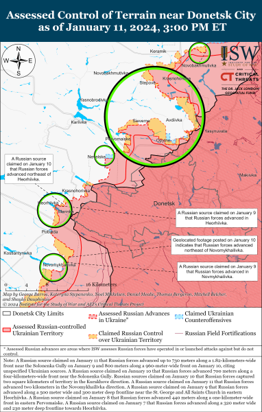 В Авдеевке Донецкой области продолжались позиционные бои, однако подтвержденных изменений на линии фронта не было. Об этом сообщили аналитики Института изучения войны в ежедневном отчете за 11 января.