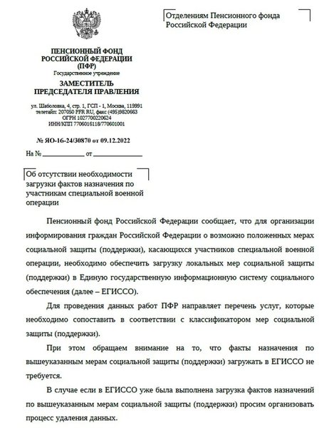 Так, ряд региональных филиалов ПФ РФ, в частности в Курской, Брянской, Белгородской областях, уже получили письма с указанием перестать загружать в "Единую государственную информационную систему социального обеспечения" информацию о фактах назначения финансовой поддержки и социальных мероприятий участников так называемой "СВО" и их семей.