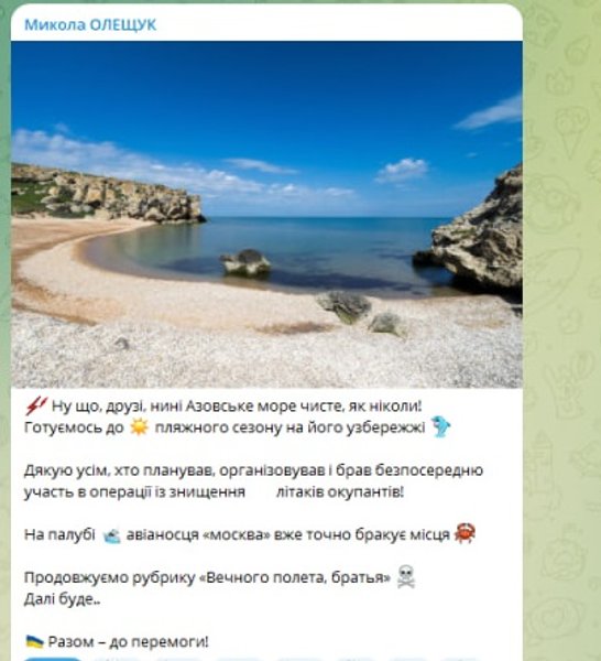"Ну что, друзья, сейчас Азовское море чистое, как никогда! Готовимся к пляжному сезону на его побережье. На палубе авианосца "Москва" уже точно не хватает места. Продолжаем рубрику "Вечного полета, братья". Дальше будет...", — написал он.