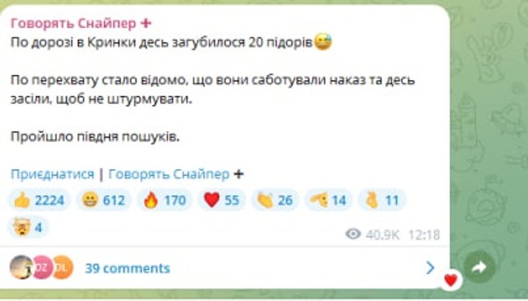 В Херсонской области командование оккупантов обеспокоилось отсутствием двух десятков россиян, которые должны были идти на штурм позиций Сил обороны в Крынках. Те ушли, и где-то исчезли. Об этом в своем телеграмм-канале "Говорят Снайпер" сообщил боец ВСУ Станислав Бунятов с позывным "Осман", доброволец 24 ОШБр "Айдар".