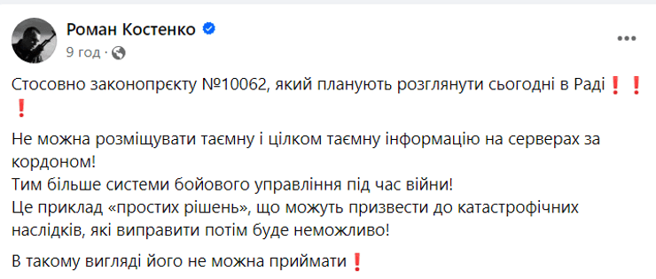 Роман Костенко отметил, что нельзя размещать секретную и совершенно секретную информацию на серверах в других государствах. Такая норма, по его мнению, способна повлиять на систему боевого управления во время войны.